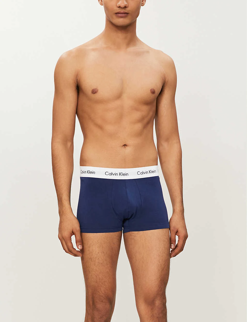 Calvin Klein pack of three stretch-cotton trunks Pulls on Classic-fit, low-rise, branded elasticated waistband, supportive centre-front pouch, exposed stitching, medium weight fabric 95% cotton, 5% elastane Machine wash Size medium: Waist 29″”, inside leg 2.5″” Model is 6ft and wears a size medium