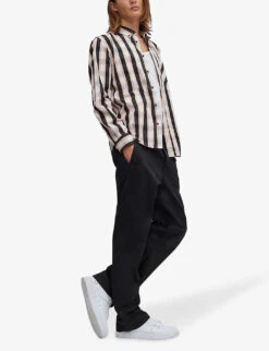 - Regular fit, long sleeves, pleated cuffs, all-over striped pattern, pearlescent buttons, curved hem