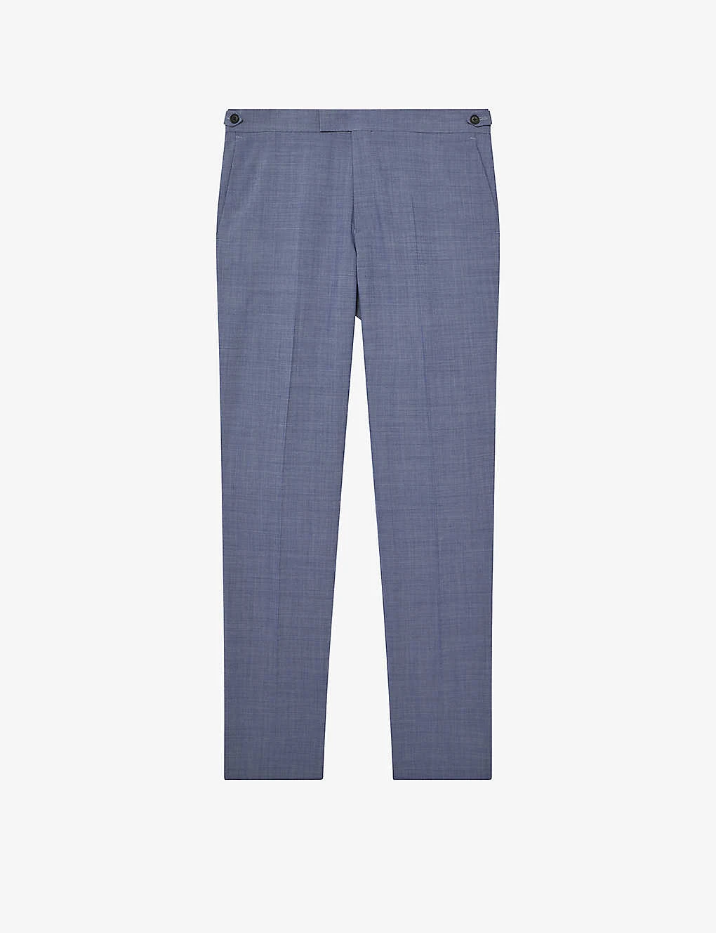- Slim fit, straight leg, mid-rise, belt loops, side adjusters at side waist, two slip pockets at sides, pressed traveller’s crease at front, lined