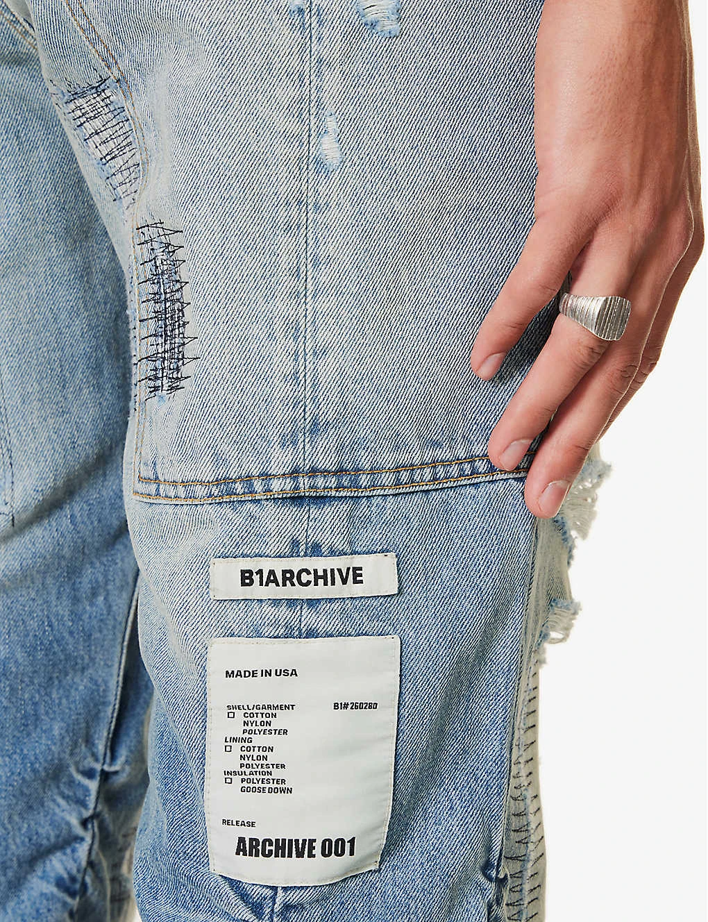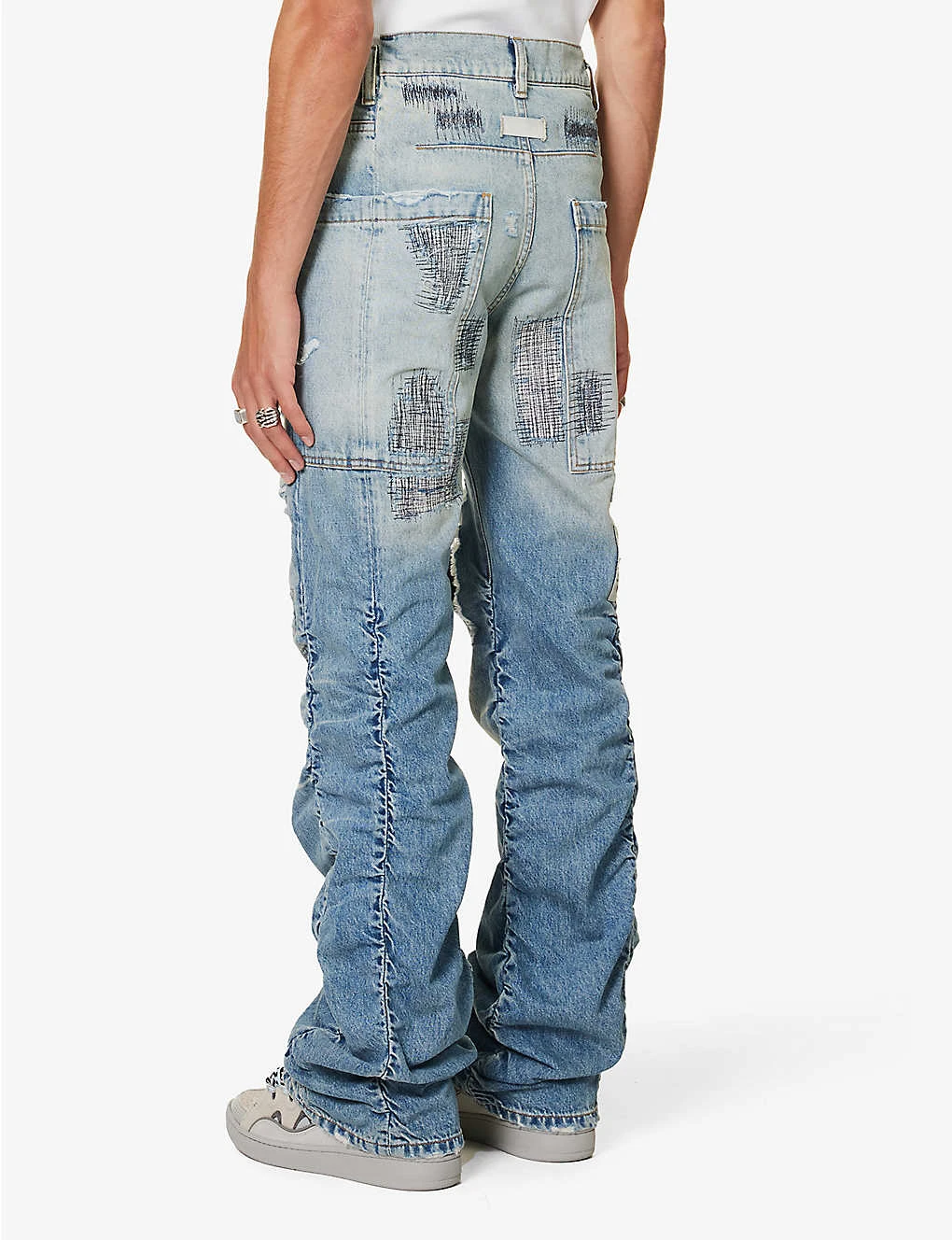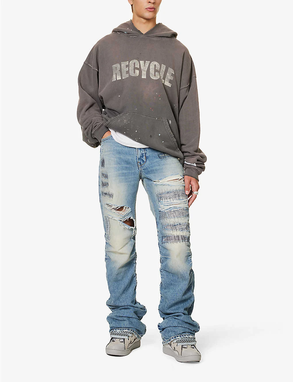 - Relaxed fit, mid-rise, straight leg, five pockets, locker-loop at back, faded wash, ruching at legs, distressed finish