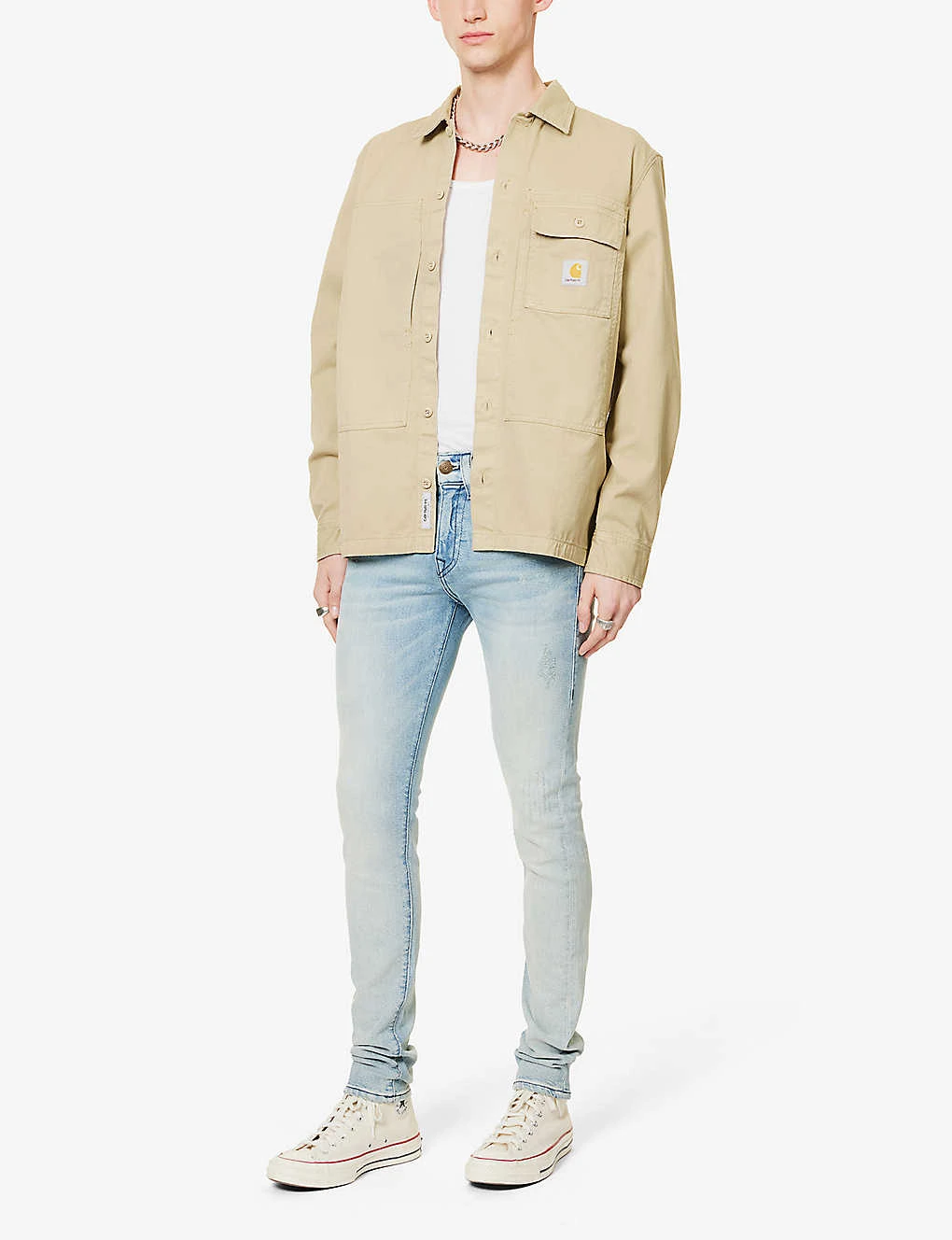 - Slim fit, mid rise, tapered leg, belt loops, branded hardware, five pockets, contrast stitching, whiskering, branded patch at back, embroidered branding at back, all-over distressed panels and faded wash, partially lined