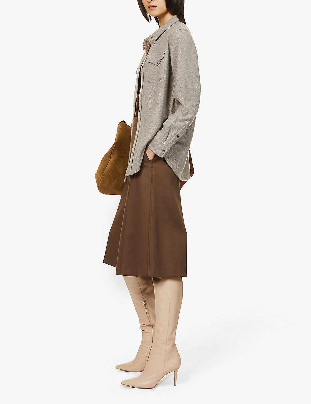 - Relaxed fit, collar, long sleeves, buttoned cuffs, knife pleats at cuffs, labradorite popper fastenings, two flap pockets at chest, curved hem, dipped hem at back