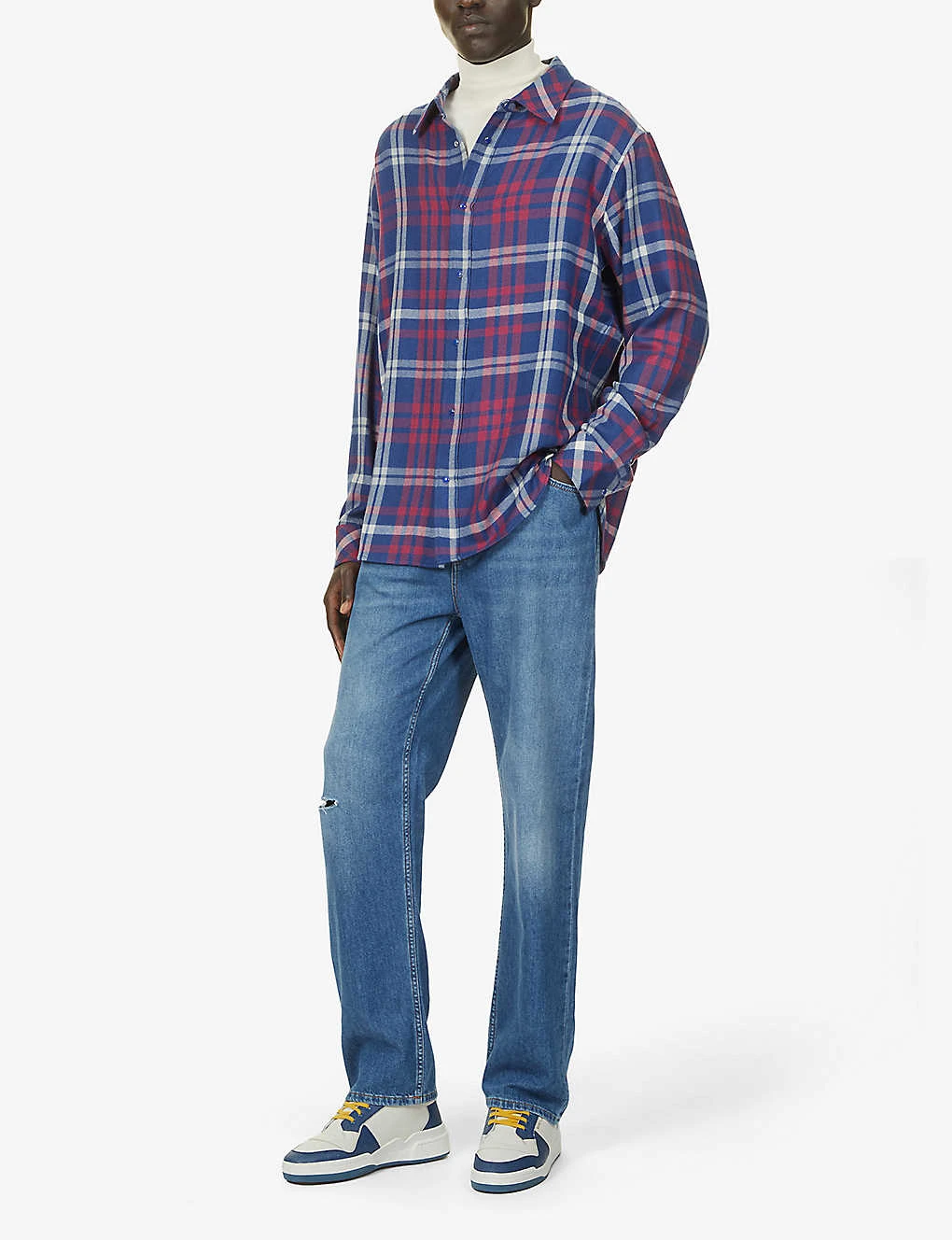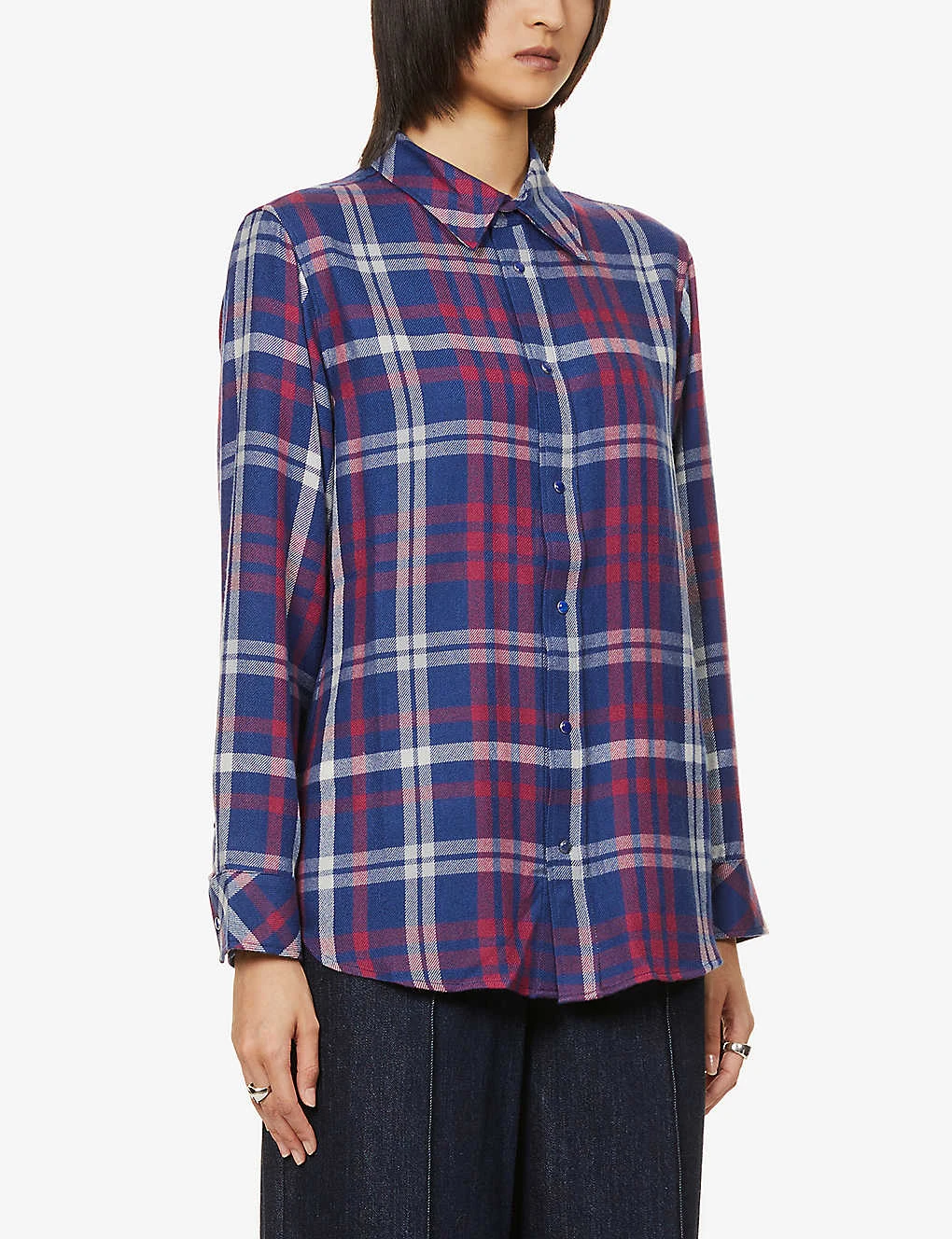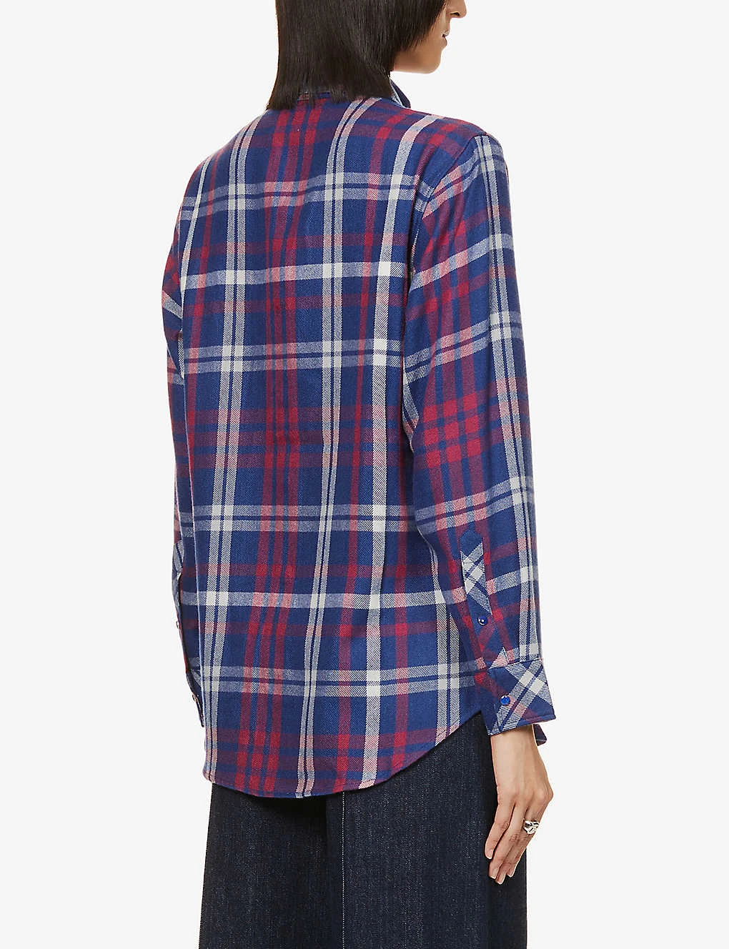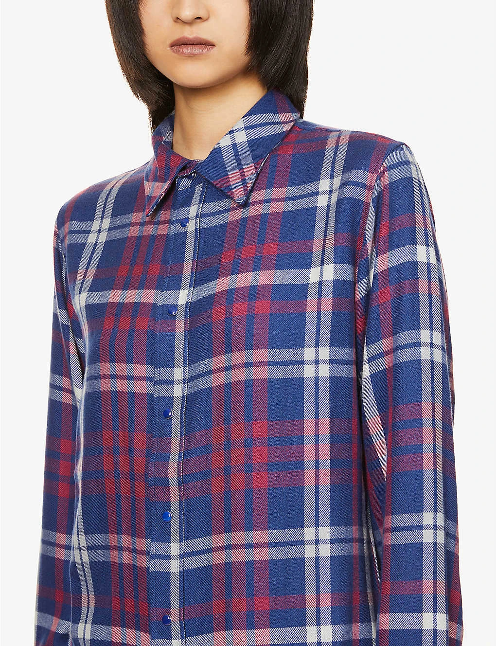 - Relaxed fit, collar, long sleeves, lapis lazuli popper fastenings, all-over plaid pattern, curved dipped hem at back